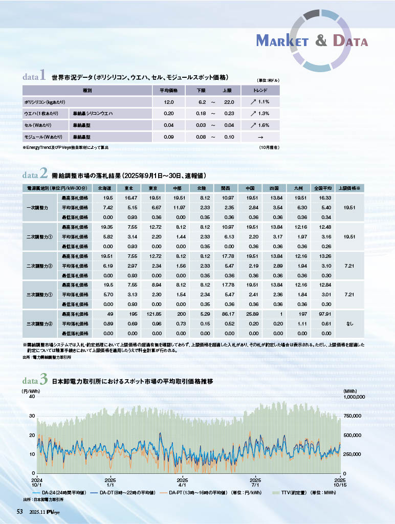 世界市況データ(ポリシリコン、ウエハ、セル、モジュールスポット価格)/ 需給調整市場の落札結果(2025年9月1日~30日、速報値)/日本卸電力取引所におけるスポット市場の平均取引価格推移