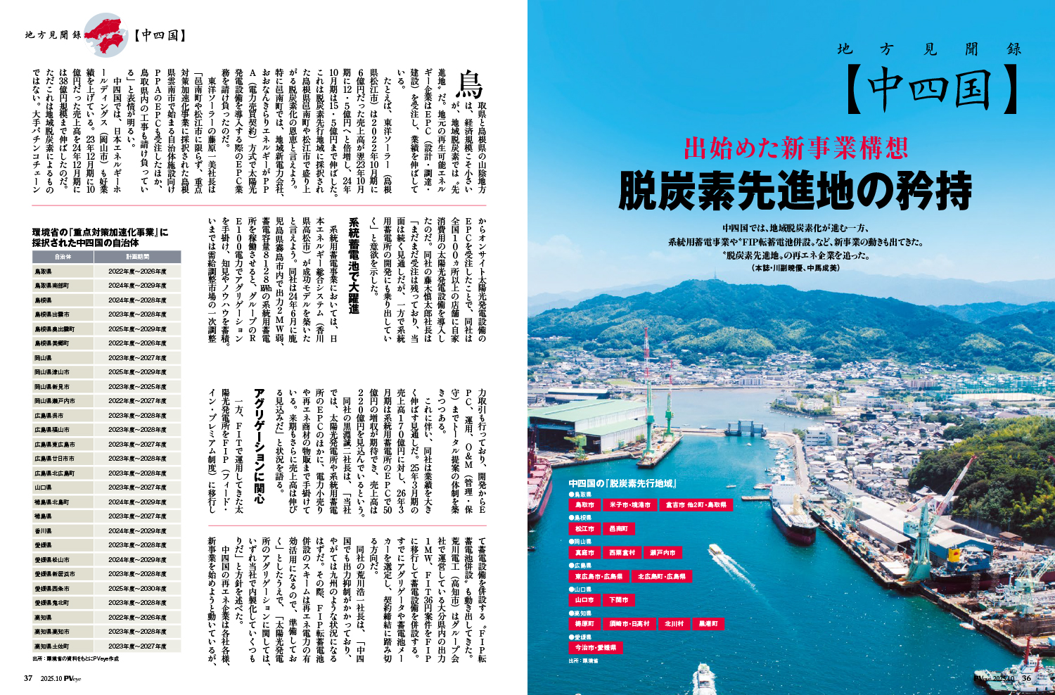 中四国では、地域脱炭素化が進む一方、系統用蓄電事業や〝FIP転蓄電池併設〟など、新事業の動きも出てきた。〝脱炭素先進地〟の再エネ企業を追った。