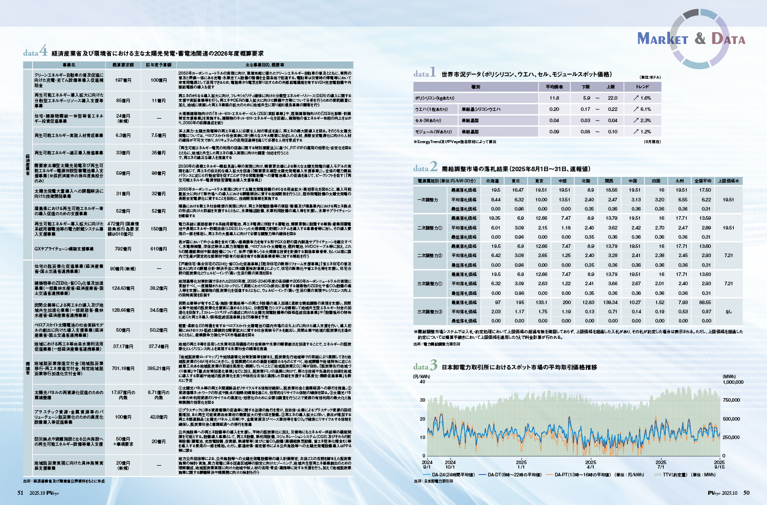 世界市況データ(ポリシリコン、ウエハ、セル、モジュールスポット価格)/需給調整市場の落札結果(2025年8月1日~31日、速報値)/日本卸電力取引所におけるスポット市場の平均取引価格推移/経済産業省及び環境省における主な太陽光発電・蓄電池関連の2026年度概算要求/世界太陽光関連企業 決算データ
