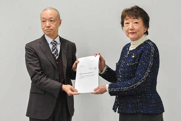 仙台市環境審議会から仙台市へ答申書が手渡された。左から仙台市環境審議会の風間聡会長と郡和子仙台市長