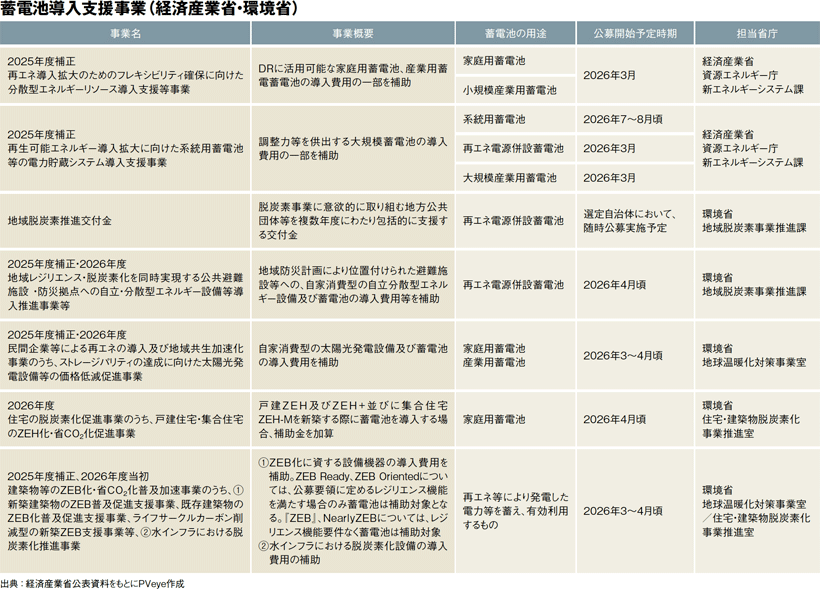 太陽光発電所に併設する蓄電池の補助金、『ストレージパリティの達成に向けた太陽光発電設備等の価格低減促進事業』では、定置用蓄電池に対して補助対象経費の3分の1を補助する。また『再エネ導入拡大のためのフレキシビリティ確保に向けた分散型エネルギーリソース導入支援事業』では、法人向けオンサイト蓄電池でDR(需要応答)に応じる蓄電池への補助も行う。