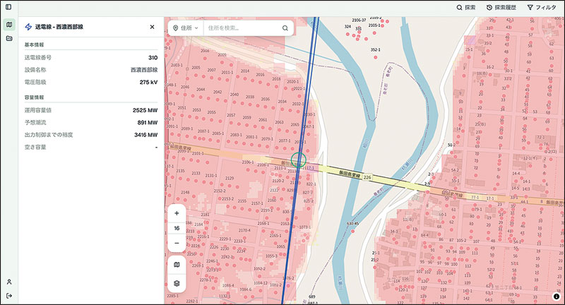 同社は、複数の地理情報を一画面に集約して候補地の選別と比較検討を支援するシステムをSaaS(クラウド型ソフトウェア)方式で提供する。一般送配電事業者が公開しているデータを収集してシステムに統合し、送配電網の運用容量値や予想潮流、出力抑制までの裕度の最新情報を送配電網の情報に反映する。利用者は、送電線までの距離、農地面積などをフィルタリングしながら候補地を探すことができる。
