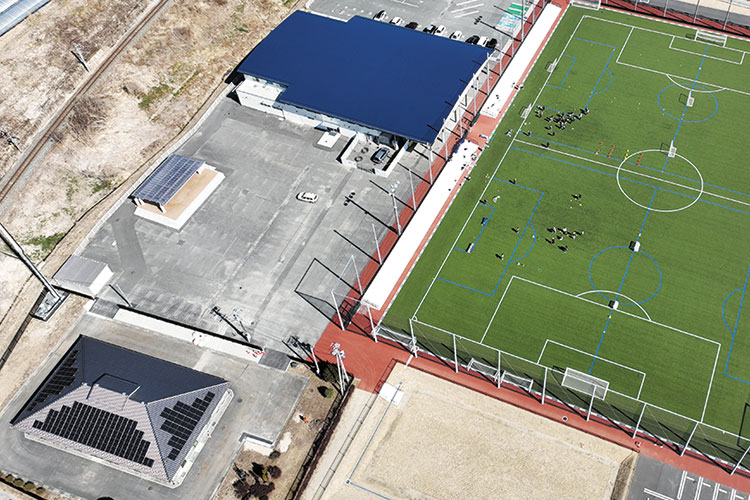 サッカー場の左斜め下にある施設にリックスが太陽光発電設備とソラックスパワー製の蓄電設備を導入。夕方以降はサッカー場の照明を蓄電設備から給電で賄う仕組み