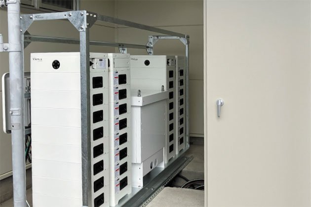 具体的には、出力16.5kWのハイブリッド型PCS(パワーコンディショナ)2台にそれぞれ容量3.68kWhの蓄電池モジュールが16台ずつ計32台設置された。軽量・小型で運びやすく、細かく増設できる点が決め手になったようだ。