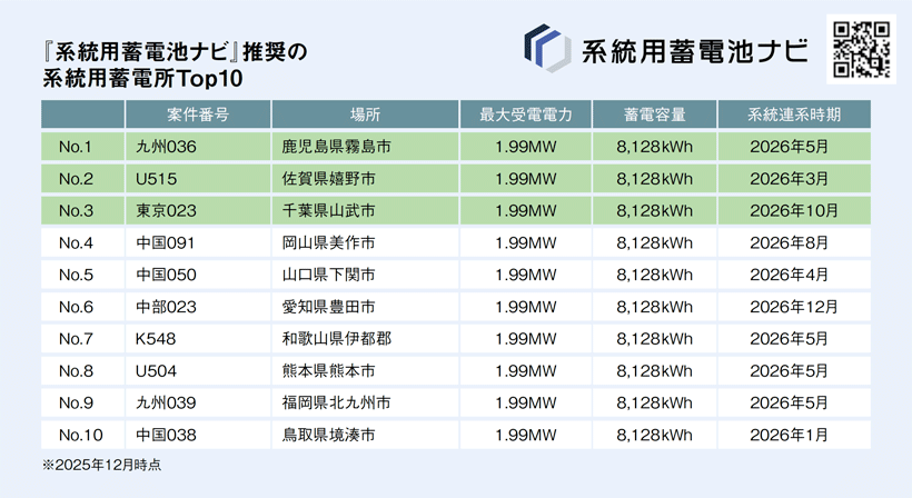蓄電所開発の日本エネルギー総合システムがお薦めの系統用蓄電所を公開した。グループのRE100電力が運営する『系統用蓄電池ナビ』で選りすぐりの10案件である。要チェックだ。