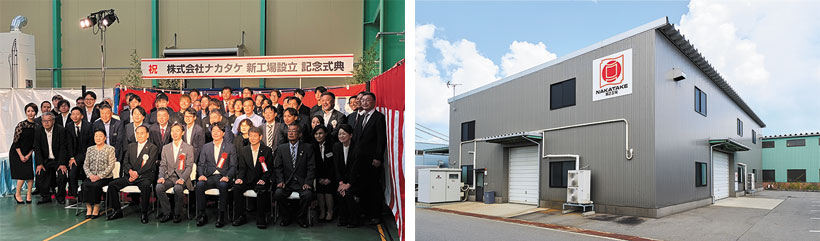 ナカタケは2025年8月27日に新工場で開所式を開催した(写真左)。同社が開設した太陽光パネルの中間処理工場の外観(写真右)