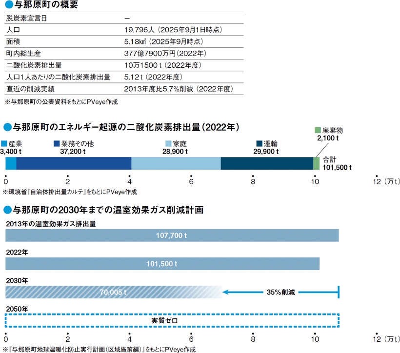 沖縄本島南部の東海岸に位置し、本島内で最も面積の小さい与那原町は2020年に『自給自足のまち・よなばる』を掲げ、太陽光発電による電力の〝地産地消〟を進めた。19年度と20年度には、みやまパワーホールディングスとの実証事業で、住宅にPPA(電力売買契約)で太陽光発電設備を導入しつつ、町民にEV(電気自動車)を貸し出した。23年12月には脱炭素計画を策定。30年までに町内の二酸化炭素排出量を13年度比35%削減し、50年までに実質ゼロにする目標を掲げた。
