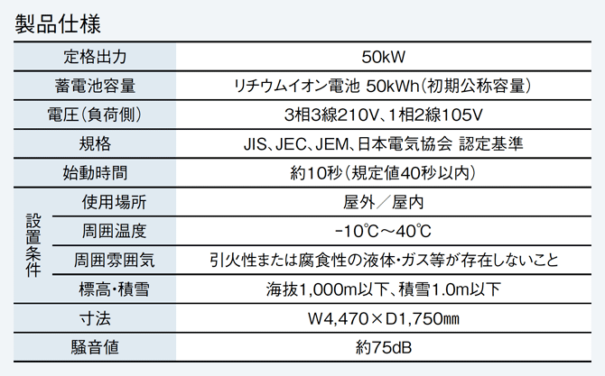 同社によれば、同製品で契約電力500kW未満の施設で、最大デマンド値20kWのピークカットを行い20年間運用した場合、設備費や維持管理費、電気料金の削減を含めたコストは、出力100kWのディーゼル発電機と比べて10%以上削減できるという。防災用蓄電設備の出力は50kW、蓄電容量は50kWhで、屋内外で設置できる。2025年12月中に消防設備としての認定を取得する予定だ。