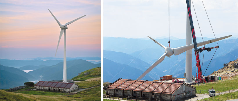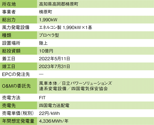 高知県梼原町が運営する風力発電所。町は1999年、四国カルスト高原に出力600kW、2基の風車を設置して発電事業を開始。2022年6月の運転停止まで稼働させ、売電収入は住宅向け再生可能エネルギー設備の導入補助や森林整備の助成に充ててきた。その後、設備の老朽化に伴い、全面改修工事を実施。ドイツから新しい風車を輸送船で運び、須崎港でブレードや柱などパーツごとに荷下ろしした。現地までの輸送は困難を極めたが、23年7月に竣工し、同年8月には出力1990kWの風力発電所として再稼働した。
