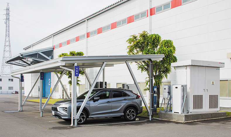 ウェーブエナジーが蓄電設備の実証を行っている自社の第1工場にはソーラーカーポートやEV充放電器も設置