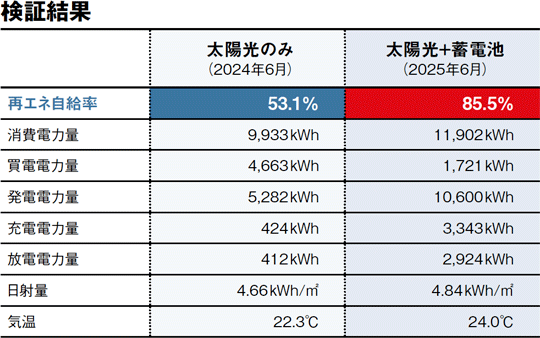 具体的には、25年6月の1ヵ月間、太陽光発電設備と蓄電設備を併用して再エネ電力の自家消費率を計測したところ、85.5%に達した。太陽光発電単体の自家消費率が53.1%だったため、蓄電設備によって自家消費率が32ポイント以上向上したことになる。