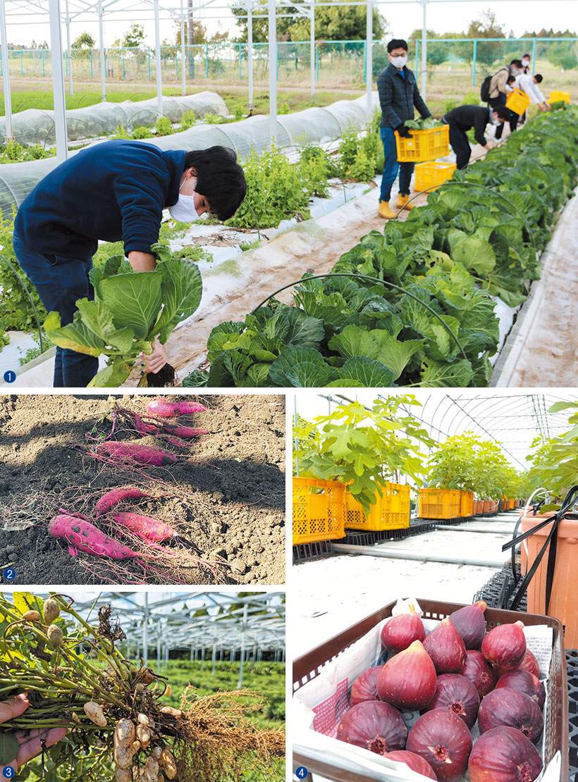 ❶つなぐファームは3人の従業員を雇用している。❷サツマイモの一部はスイートポテトに加工し、販売まで行う6次産業化を進めている。❸千葉県が産地の落花生の栽培も行う。❸栽培する作物は適性を見ながら適宜変化させている。写真はイチジクの収穫の様子